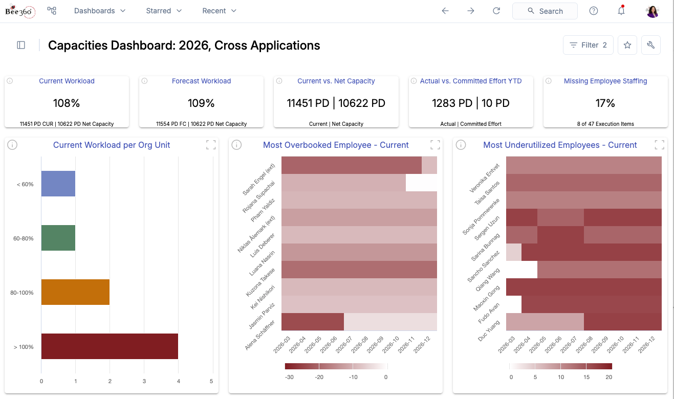Most IT organizations cannot answer that question with precision: they know their headcount, their payroll, and their project list, but they do not have a current, integrated view of how individual capacity is being deployed across services, active projects, and operational work. Bee360's capacity management approach builds that view systematically — starting with the service structure that defines run-the-business commitments, then layering in project and initiative demand, and finally surfacing the gap between what is committed and what is available.